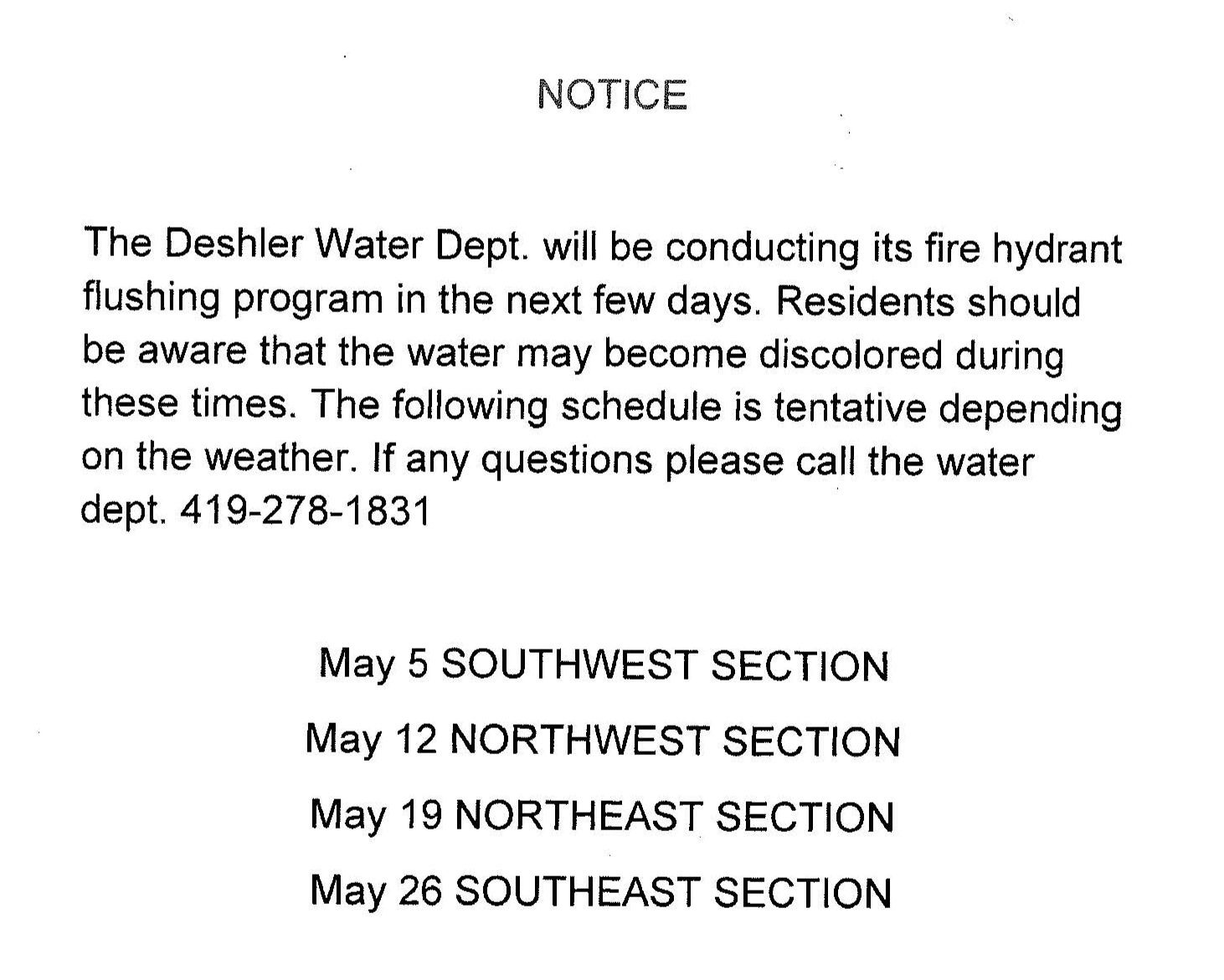 The Deshler Water Department will be conducting its fire hydrant flushing program in the next few days. Residents should be aware of that the water may become discolored during these times. The following schedule is tentative depending on the weather. If any questions please call the water dept 419-278-1831